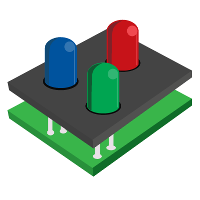 Durchgangsloch LEDs sind mit Leitungen montiert, die durch die Leiterplatte hervorstehen, und scheinen größer zu sein. Jede LED ist ein Single-Color sterben entweder rot, grün oder blau.