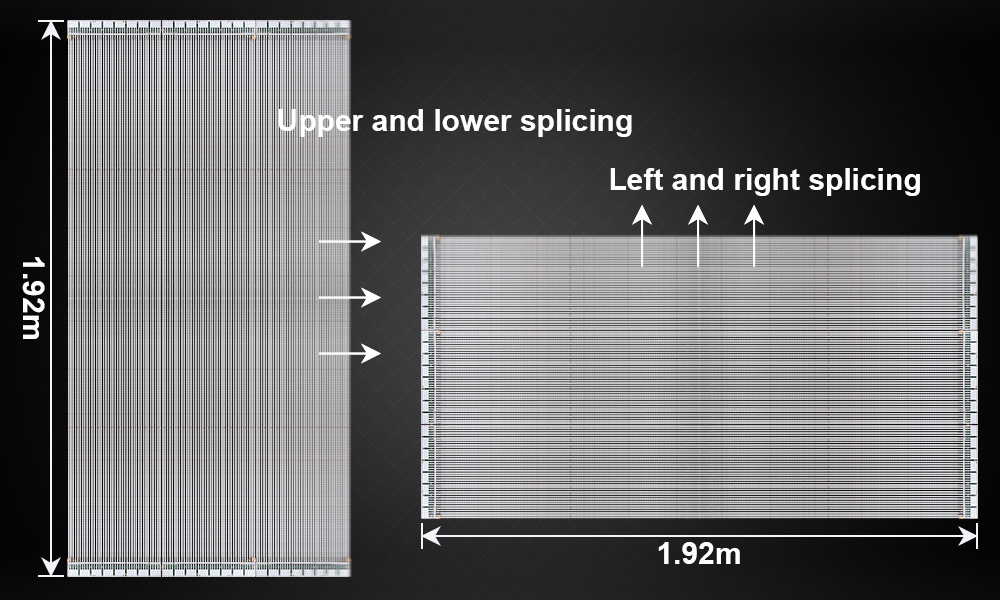 Links und rechts oder oben und unten gespleißt, wodurch eine Anzeigehöhe oder -breite von 1,92 Metern und unbegrenztes Spleißen in andere Richtungen erreicht werden kann