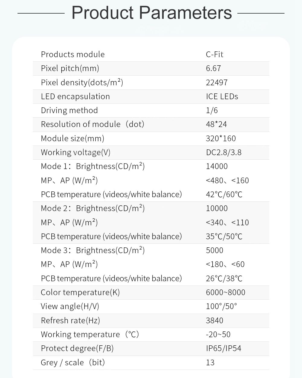 5 Hoher Schutzgrad: Der Schutzgrad der Vorderseite des Schranks erreicht IP65; Die LED-Bildschirme der C-Fit-Serie halten den üblichen Außenbedingungen stand;