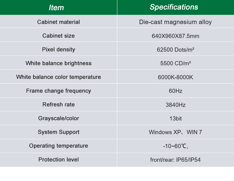 1 Hohe Helligkeit, Energieeinsparung: Diese C-Fit-Serie verfügt über ein 2,8-V-/3,8-V-Niederspannungsnetzteil, das eine hervorragende Energieeffizienz bietet. Gleichzeitig liefern die ICE-LED-Perlen eine hohe Helligkeit bei geringem Stromverbrauch. 2 Hervorragende Bildqualität: Die Vorderkantenaustastschaltung sorgt für eine wirksame Eliminierung von Geisterlinien. Mit dem Weißabgleich unter einem niedrigen Grauwert wird eine gute Bildqualität ohne Farbabweichungen erreicht. 3 Ultradünn: Das Gehäuse besteht aus einer Magnesiumdruckgusslegierung (Gewicht des leeren Gehäuses: ï¼15 kg, Gewicht des fertigen Gehäuses: ï¼35 kg; Dicke des Gehäuses: 87 mm); Dies erleichtert den Transport und die Installation der Schränke. 4 Hochpräzise: Jeder Schrank wird im Druckguss- und CNC-Verfahren hergestellt, sodass jeder Schrank nahtlos zusammengefügt werden kann; 5 Hoher Schutzgrad: Der Schutzgrad der Vorderseite des Schranks erreicht IP65; Die LED-Bildschirme der C-Fit-Serie halten den üblichen Außenbedingungen stand;6 Hocheffiziente Wärmeableitung: Das selbst entwickelte Wärmeableitungssystem sorgt dafür, dass die Wärme in jeder Ecke des Schranks durch doppelten Strom und Unterdruck schnell abgeführt werden kann; Dadurch wird sichergestellt, dass der LED-Bildschirm immer normal funktionieren kann, ohne dass es zu Problemen mit der Wärmeableitung kommtï¼ 7 Schnelle Installation: Jeder Schrank ist mit Schnellverschlüssen verbunden und das Zusammenfügen von zwei Schränken dauert nur 10 Sekunden; 8 Breite Anwendung: Als an der Wand montierter/hängender Bildschirm kann die C-Fit-Serie in einer Vielzahl öffentlicher Außenbereiche wie Stadien, Einkaufszentren, Docks, Bushaltestellen, Schulen und Straßenrändern eingesetzt werden;
