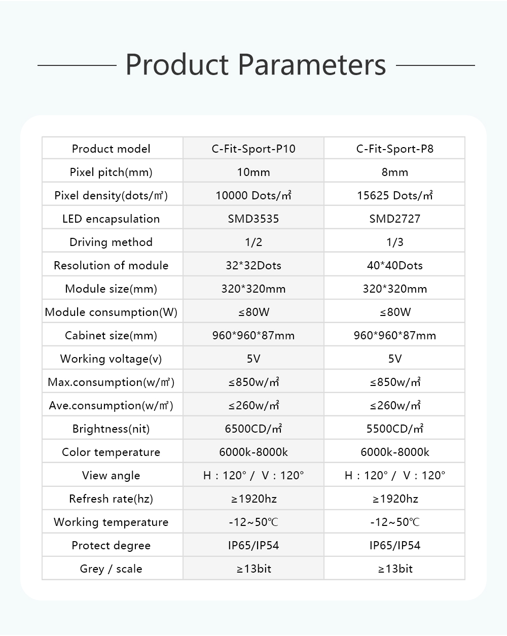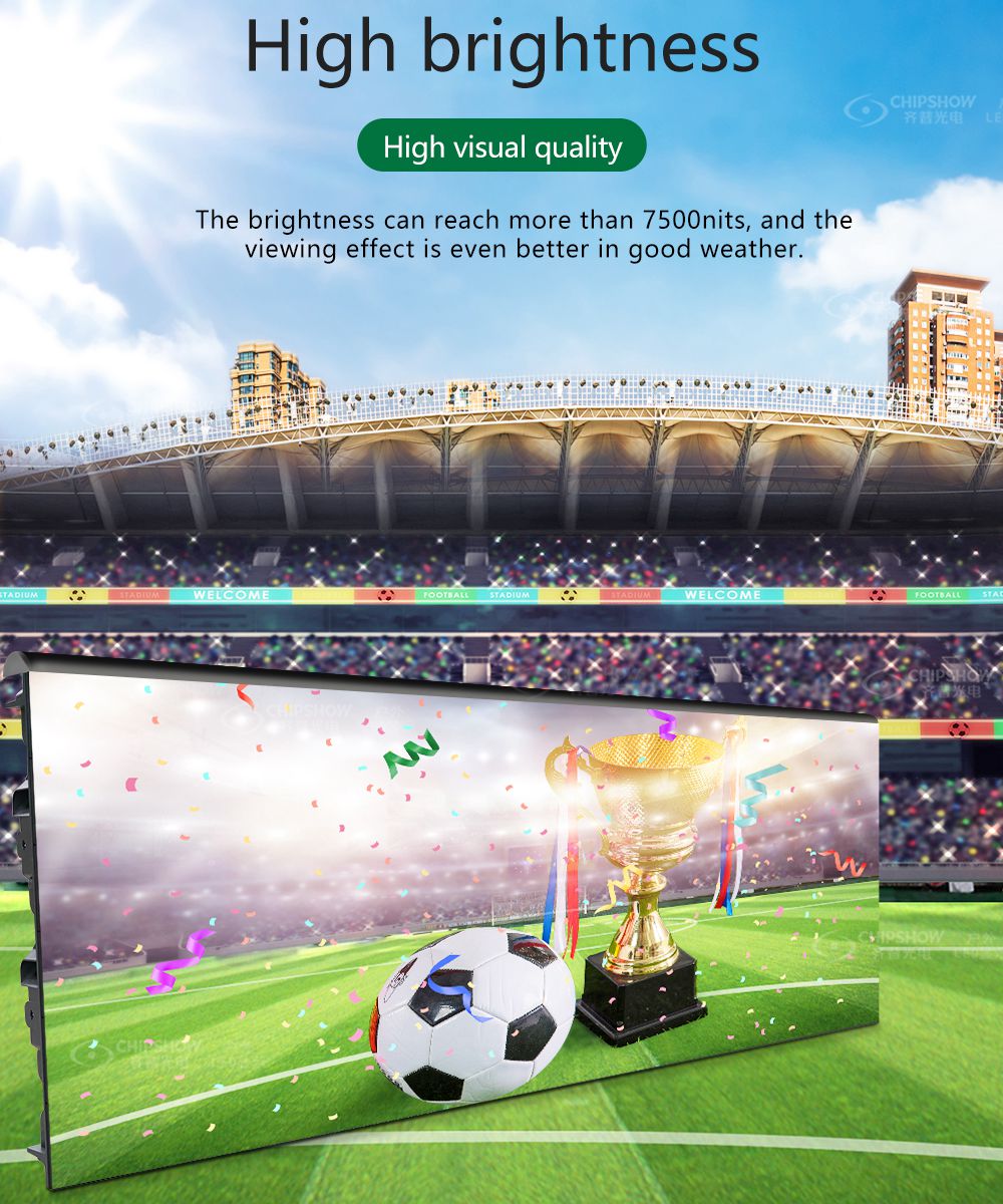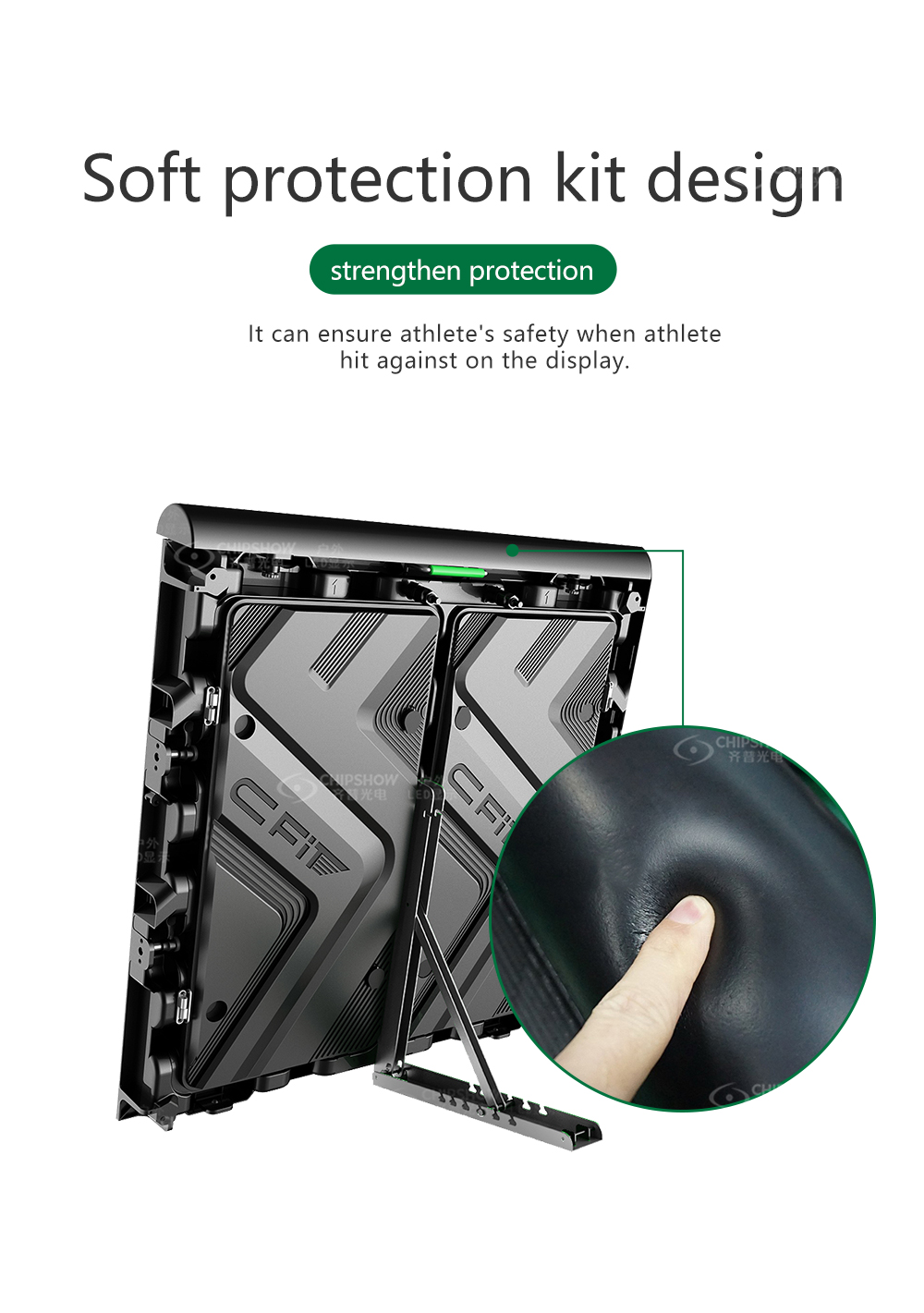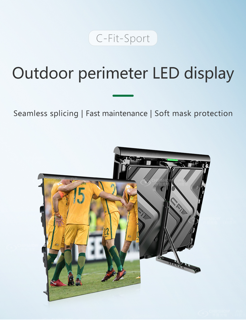 C-Sport P8-Stadionrand-LED-Bildschirme werden häufig für die digitale Bandenwerbung verwendet; Merkmale: 1 Jeder Schrank ist mit Links- und Rechts-Schnellverschlüssen und einer um 90 Grad verstellbaren, drehbaren Halterung ausgestattet, um eine schnelle Montage der Perimeteranzeige zu ermöglichen. 2 Jeder Bildschirm wird mit weichen Kissenschonern und weichen LED-Modulmasken geliefert, sodass sowohl Sportler als auch LED-Bildschirme vollständig geschützt sind. 3 Die Aluminium-Power-Box hat nicht nur ein geringes Gewicht, sondern auch eine hervorragende Leistung bei der Wärmeableitung; Dadurch wird der Alterungsprozess von Leistungsmodulen wirksam verlangsamt. 4 Jedes LED-Modul unterstützt den Front-and-Rear-Service, was die Bedienung während der Installation und späteren Wartung erleichtert; 5 Die Vorder- und Rückseite des Gehäuses sind staub- und wasserdicht und erreichen die Schutzart IP65; 6 Im Vergleich zu herkömmlichen LED-Bildschirmen ist die Chipshow C-Sport-Serie energiesparend – etwa 1/3 des Energieverbrauchs kann eingespart werden; dies reduziert die Betriebskosten erheblich;   7 Der Bildschirm wird außerdem mit professioneller Bandenwerbesoftware geliefert, die verschiedene Videoeingangsquellen wie DP, HDMI, VGA, SDL und DVD unterstützt;