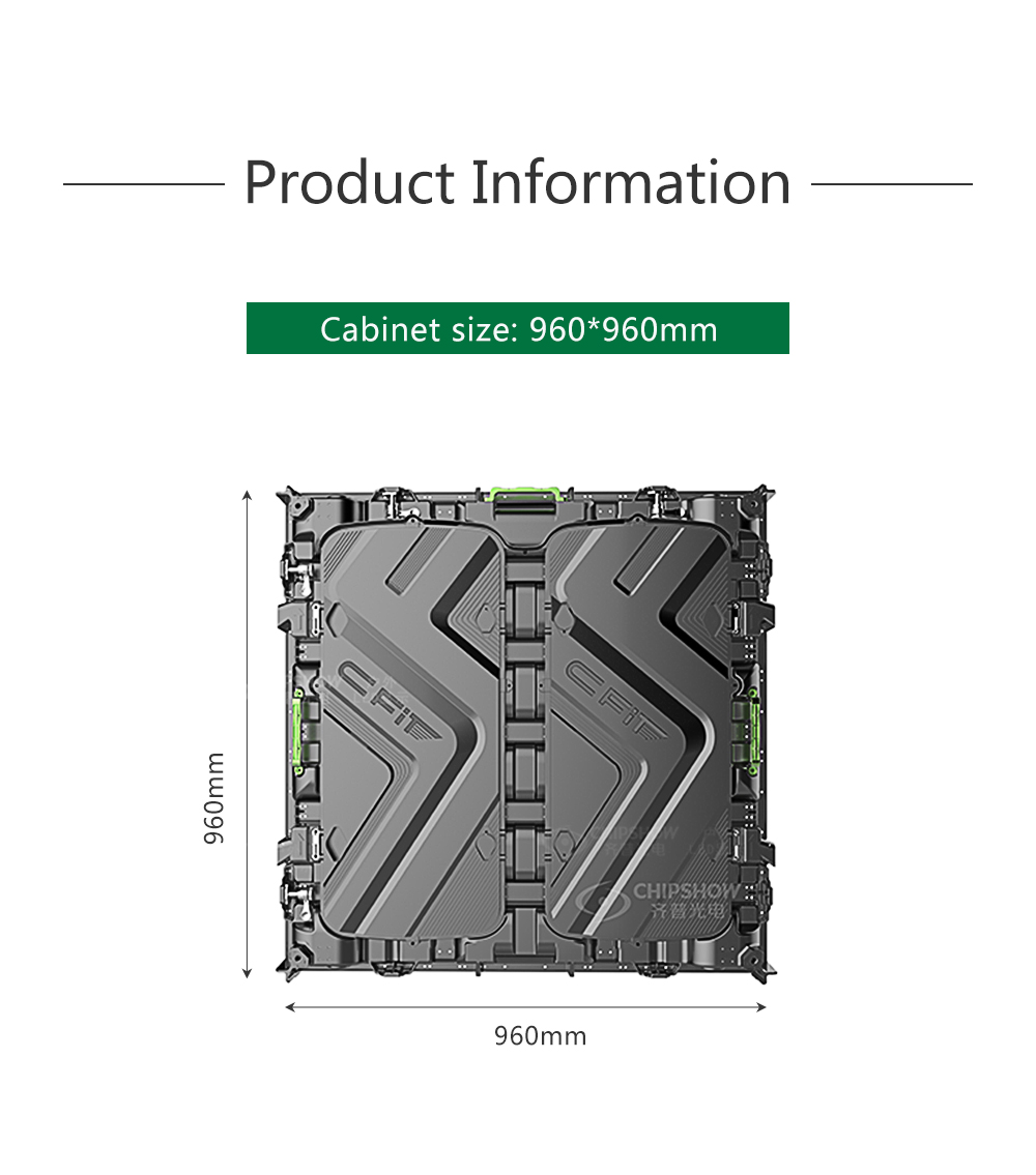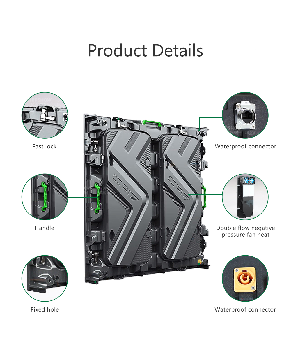 1.Der Kastenkörper besteht aus einer Aluminiumlegierung, die leicht, dünn und schön im Aussehen ist. 2. Das Modul ist vollständig von vorne gewartet, weist eine gute Ebenheit auf und ist einfach zu installieren und zu demontieren. 3. Der Kastenkörper verfügt über eine interne Verkabelung und die Verkabelung ist einfach, wodurch das Spleißen des Kastenkörpers perfekt realisiert wird. 4. Das Gehäuse verfügt über eine gute Wärmeableitung, keinen Lärm, Energieeinsparung und Umweltschutz. 5. Der Kastenkörper wird an der Wand installiert, die häufig in der kommerziellen Präsentation, in der Innenwerbung, im Auditorium, im Konferenzraum, im Bankett, in der Eingangshalle, bei Ausstellungsvorführungen, im Transportwesen, im Studio, bei der Steuerung und Überwachung verwendet wird. 6.Geeignet für P2.5, P2.6, P2.97, P3.91 äquidistante 250*250mm Module; 7. Der Karton ist leicht zu schneiden und kann auf die Größe 1000/750/500*250 mm hergestellt werden;