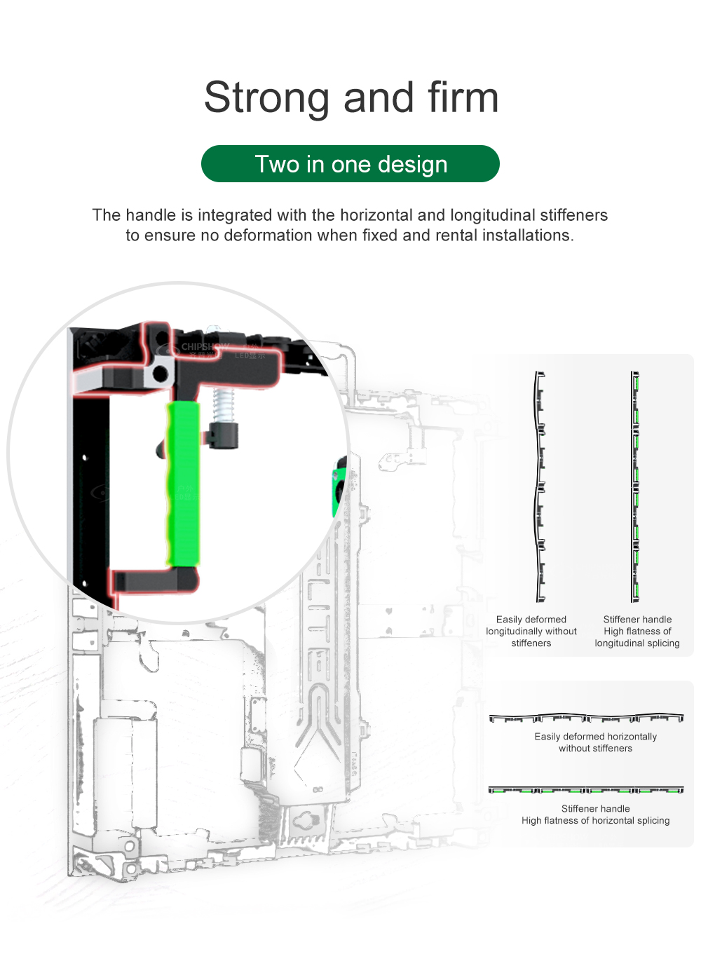 Stark und fest: Der Griff ist in die horizontalen und longitudinalen Versteifungen integriert, um sicherzustellen, dass er sich bei Fest- und Mietinstallationen nicht verformt.
