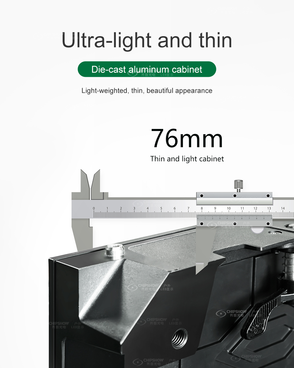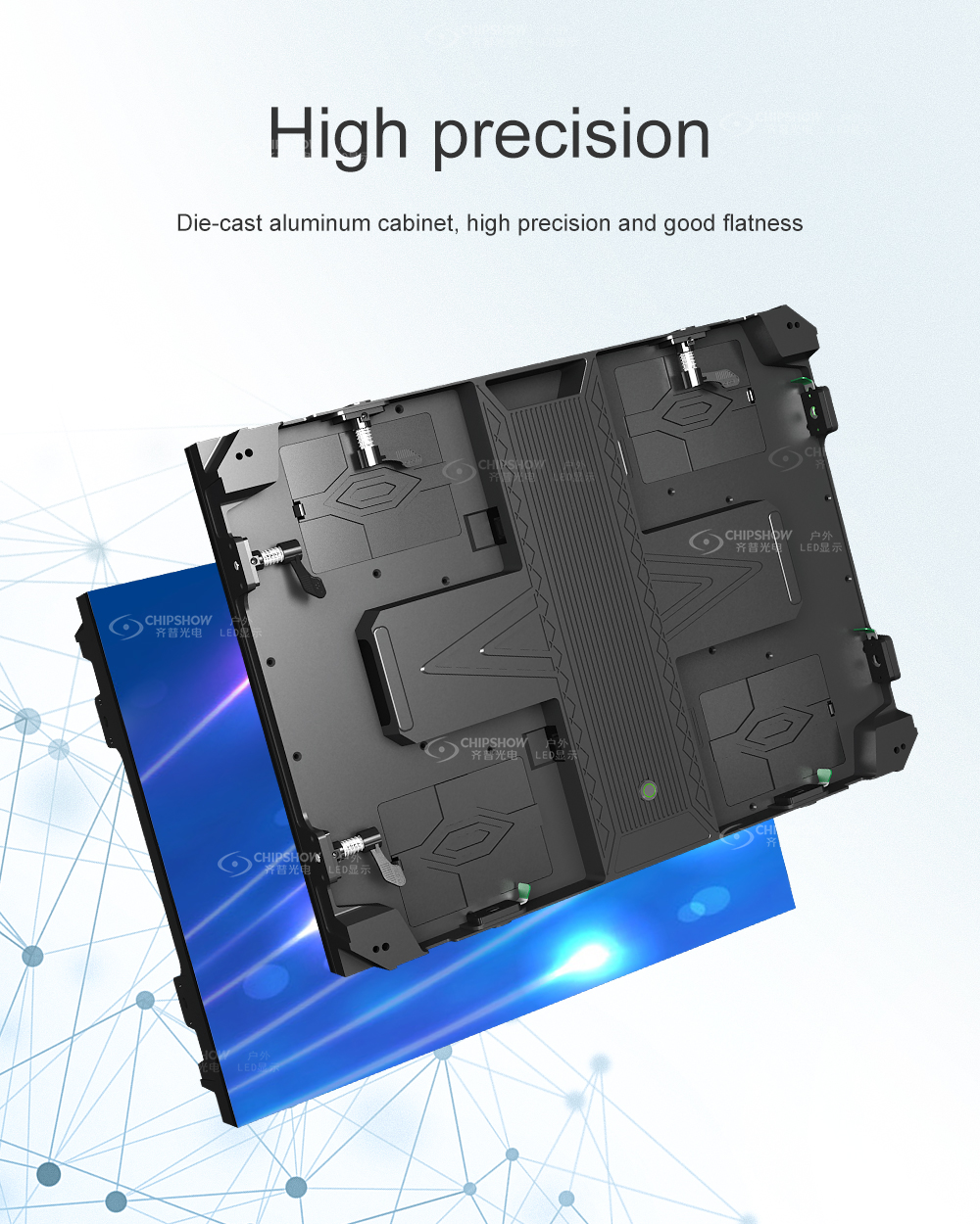 Präzisions-Magnesiumlegierung Titel: Hochpräzisions-Magnesium Körper: Gehäuse aus Magnesium-Druckgusslegierung bieten im Vergleich zu Eisen eine überlegene Stabilität. Diese Präzision ist entscheidend für Feinraster (P1,2–P1,8), um lückenlose Verbindungen und eine glatte Sichtfläche zu gewährleisten.