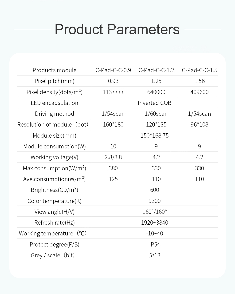 1, Hohe Zuverlässigkeit: Geeignet für p0.9 p1.2 p1.5 COB-Module, feuchtigkeitsbeständig, kollisionssicher, antistatische Oberfläche, fingerabdrucksicher, die LED-Oberfläche kann sanft mit einem Tuch abgewischt werden.