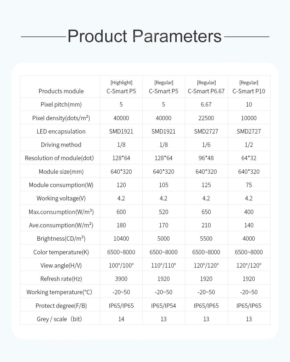 C-Smart ist ein einfach integrierter, wartbarer LED-Bildschirm vorne und hinten. Kein Schrankdesign, es ist nur ein einfacher Rahmen zum Halten der Module erforderlich, wodurch die Installationskosten erheblich gesenkt werden können. Vorteile: 1. Integration von Modul und Schrank, Ersatz des herkömmlichen Schranks und Kosteneinsparung. 2. Ultradünnes Design, Wandmontage, einfachere Wartung vorne und hinten. 3. Einzigartiges Maskendesign, dunkle Farbe, hoher Kontrast. 4. Modulgröße 640 mm * 320 mm, größere Größe, bessere Ebenheit. 5. Konstantstromantrieb, 1/10 Scan. 6. Hohe Helligkeit bis zu 5500 cd/㎡ und bietet die Vorteile einer guten Lichtverteilungskurve und einer guten Winkelkonsistenz. 7. IP65-Wasserdichtigkeitsgrad des Moduls.