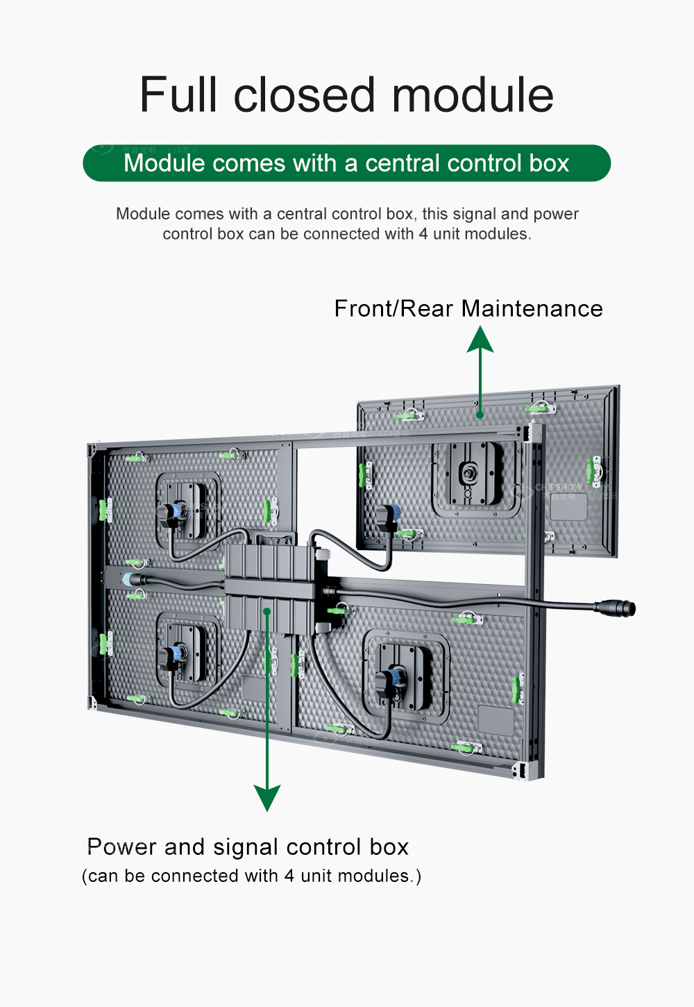 1 Vollständig geschlossene LED-Module: Jedes Modul verfügt über eine zentrale Steuerbox und eine Stromversorgungsbox, die mit 4 Einheitenmodellen verbunden ist;