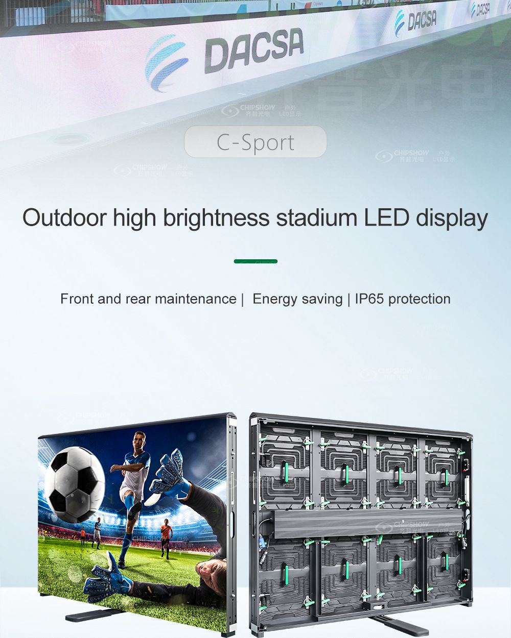 6 Im Vergleich zu herkömmlichen LED-Bildschirmen ist die Chipshow C-Sport-Serie energiesparend – etwa 1/3 des Energieverbrauchs kann eingespart werden; dies reduziert die Betriebskosten erheblich;