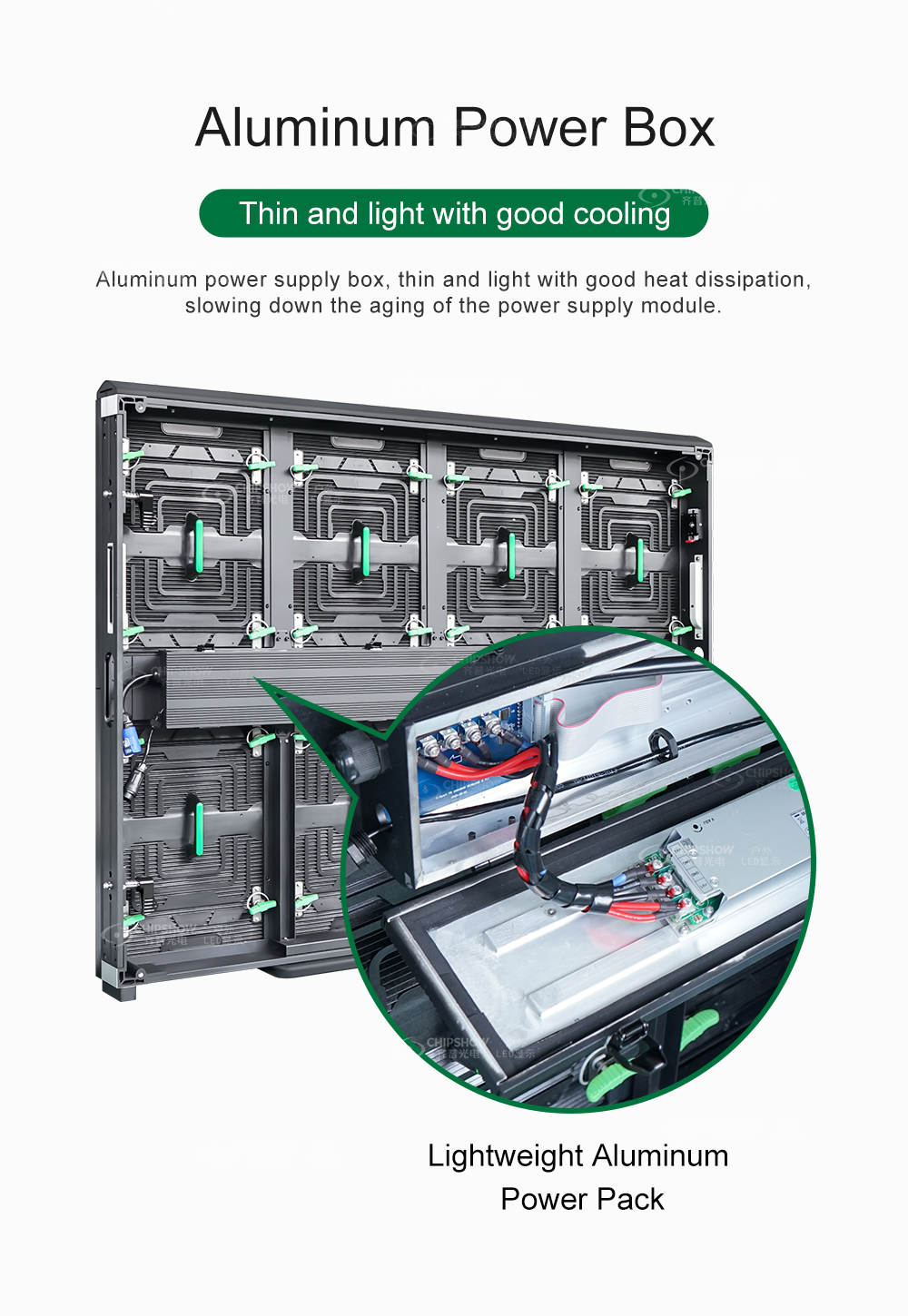 C-Lite-D ist ein hochwertiger Miet-LED-Bildschirm für eine Vielzahl von Aktivitäten. Die Steuerbox kann durch Schlösser herausgeklickt werden, und ein Schutzpolster schützt die Lampen an den Ecken vor Beschädigungen. Dadurch erhalten Sie eine bessere Erfahrung bei der Installation und Demontage. Merkmale 1. Verfügbare Stellplätze: P2,6, P2,97, P3,91, P4,81 innen/außen 2. Schrankgröße: 500*500mm/500*1000mm 3. Helligkeit: 800–1000 nit (innen), 4500–6500 nit (außen). 4. Integrierte Stromversorgung und Empfangskarte. Innerhalb von 1 Sekunde ein- und ausstecken. 5. Schnelle Verriegelung von oben und unten, links und rechts, 2 Sekunden, um Schränke zu verbinden. 6. Aluminiumdruckguss, hochfest, hochfest, hochpräzise, ​​ultrahohe Ebenheit, Ebenheitsfehler des gesamten Bildschirms ≤ 0,01 mm. 7. Antikollisionsdesign an der Unterseite des Gehäuses, Positionierung der Perlen an der Seite für eine präzise Ausrichtung. 8. Gutes Wärmeableitungsdesign, kein Lüfter und keine Klimaanlage erforderlich, weniger Lärm während der Arbeit. 9. Hohe Schutz-, Witterungs- und Salzsprühkorrosionsbeständigkeit. 10. Eine Vielzahl von Installationsmethoden, kann angehoben, fixiert oder gestapelt werden.