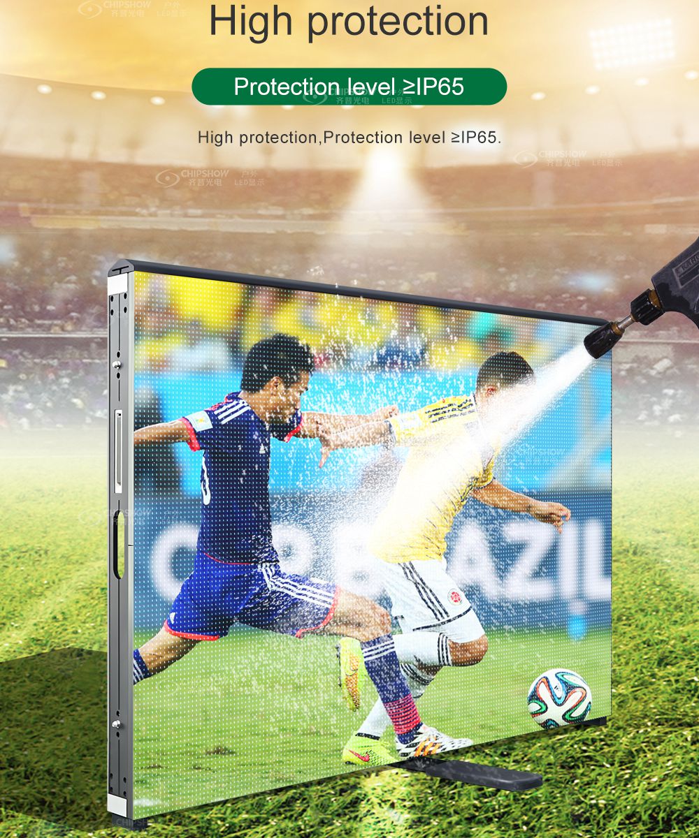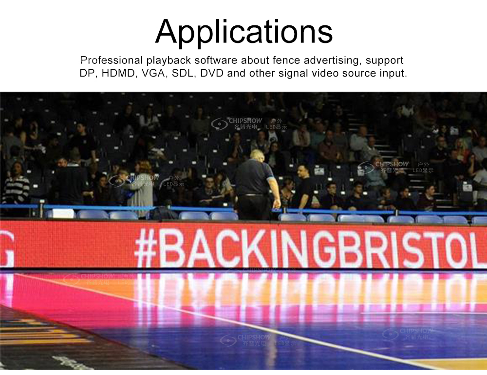 Die LED-Anzeigen P8 und P10 C-Fit-Sport nutzen die virtuelle Ersatztechnologie. Anstelle der realen Werbung im Stadion könnten virtuelle Anzeigen in verschiedene Länder übertragen werden. Vorteile: 1. Intelligente Perimeter-LED-Anzeige. 2. Virtuelle Ersatztechnologie, angetrieben durch IR-LED. 3. Schnelle Installation und Wartung des Schrankdesigns. 4. Weiches Schutzset-Design, um Spieler vor Schaden zu schützen. 5. Unterdruck-Wärmeableitungssystem garantiert zusätzlich die Zuverlässigkeit. 6. Verfügbar für die Fernüberwachung per App .