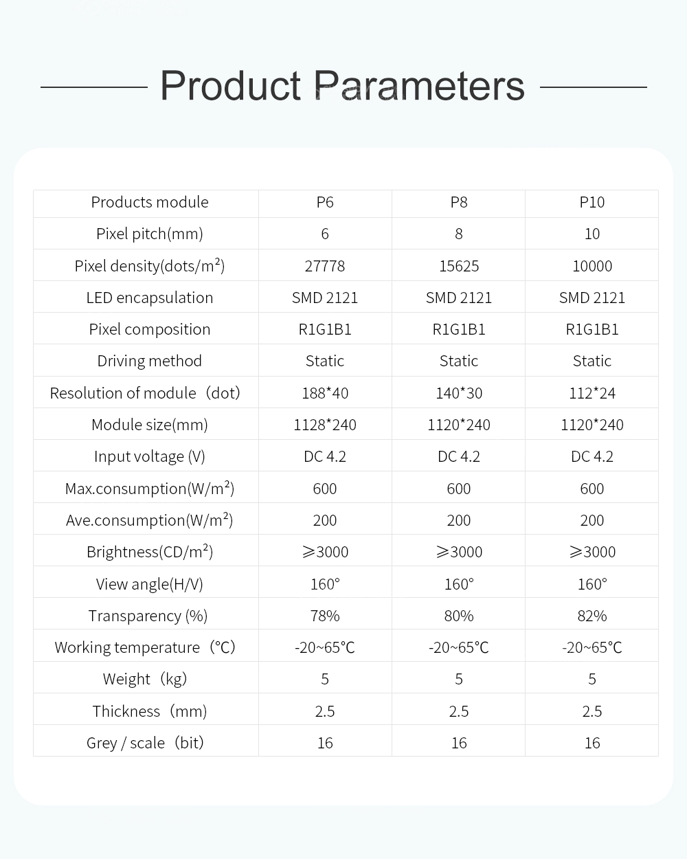 Mit den Eigenschaften hoher Transparenz, unsichtbarer Installation, ultraleicht und dünn eignet es sich sehr gut für die Markenbildung von Unternehmen. Vorteile 1. Ultraleicht und dünn, der transparente Teil ist nur 3 mm dick; 2. Verwendung hochwertiger PC-Materialien mit hoher Transparenz und hoher Temperaturbeständigkeit sowie guter Farbkonsistenz. 3. Durch das perfekte ultraschmale Design der Lichtplatinen-Leiterplatte kann problemlos eine Transparenzrate von bis zu 60 % erreicht werden. 4. Keine Lüfterstromversorgung, leise und geräuschlos. 5. Es kann schnell und problemlos direkt auf das Glas geklebt oder aufgehängt werden. 6. Verstecktes Design, alle Kabel sind im Steuerkasten untergebracht, schönes und großzügiges Erscheinungsbild. 7. Der Bildschirm kann nach links und rechts oder nach oben und unten gespleißt werden, wodurch eine Anzeigehöhe oder -breite von 1,92 Metern und unbegrenztes Spleißen in die andere Richtung erreicht werden kann. Installation Direkt auf transparentes Glas geklebt oder hängend montiert Anwendung Bühnenveranstaltung, Einkaufszentrum, Ladenkette, Wissenschaftsmuseum, Glasfenster, Glasfassadengebäude, Leasingbranche, neuer Einzelhandel usw.
