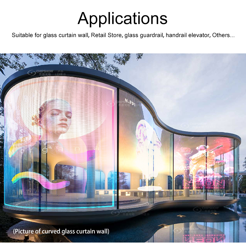 7 Breite Anwendung: Die LED-Filmanzeige ist in gewerblichen Innenräumen weit verbreitet und wird häufig für Werbung auf transparenten Medien wie Glasfassaden, Acrylwänden, Glasleitplanken usw. verwendet.