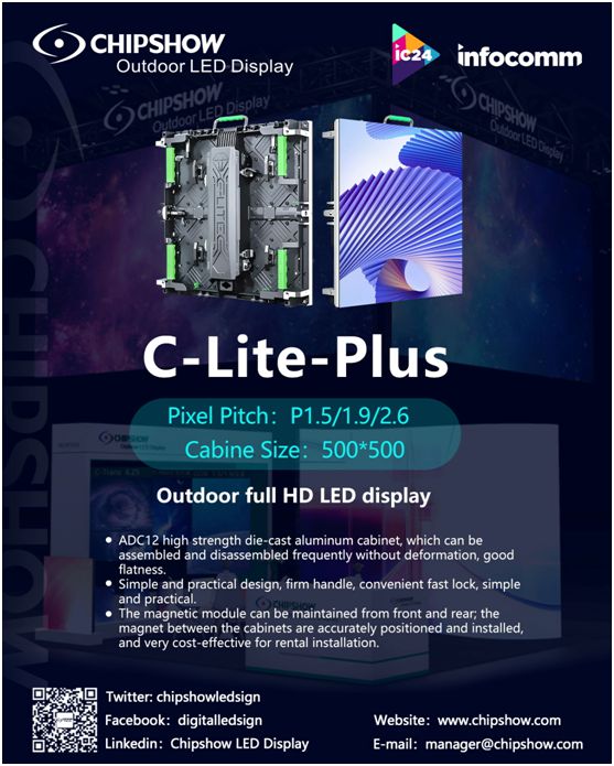 Chipshow wird seine anspruchsvollen Produkte auch seit langem auf der ganzen Welt zeigen: C-Lite-Plus P3.91 . Diese Display-Serie zeichnet sich durch hohe Ebenheit, mehrere Installationsprozesse (flach und gebogen), ein leichtes, aber stabiles Gehäuse, ein Wartungssystem für Vorder- und Rückseite usw. aus. Chipshow C-Lite-Plus kann eine Lösung für den Mietbereich im Außen- oder Innenbereich für kommerzielle Plätze, Großveranstaltungen, Theaterbühnen, Ausstellungsdisplays, DOOH-Werbung usw. sein.