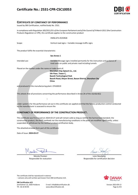 Nach vielen Tagen der Prüfung und Verifizierung hat das LED-Anzeigemodul „Chipshow VMS 6.67S – 4535RGB“ alle Details erfüllt und die Zertifizierung der Europäischen Norm EN 12966 erhalten. Diese Europäische Norm spezifiziert die visuellen und physikalischen Eigenschaften von VMS sowie deren Haltbarkeitsaspekte. Es enthält außerdem relevante Anforderungen und entsprechende Testmethoden, die Bewertung und Überprüfung der Leistungsbeständigkeit (AVCP) und die Kennzeichnung.