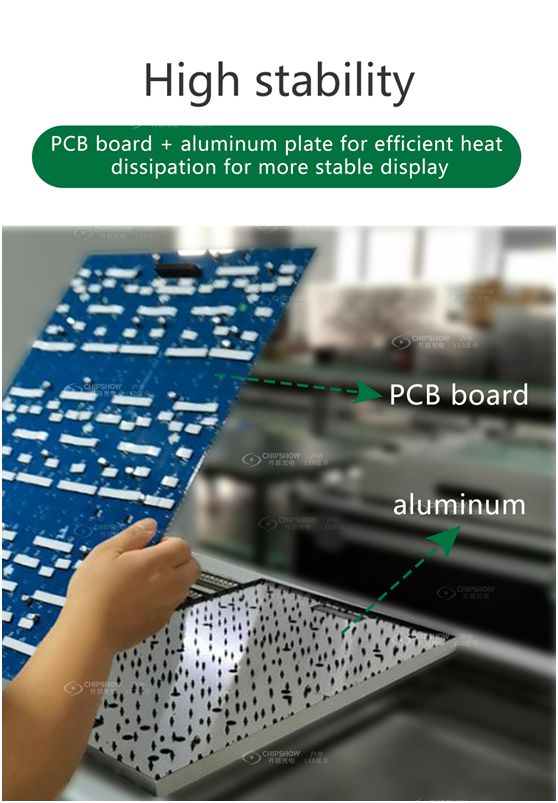 Chipshow konzentriert sich seit mehr als 20 Jahren auf die LED-Displaybranche und hat sich mit hervorragender Qualität einen langjährigen Ruf erworben. Chipshow verwendet hochwertige Leiterplatten auf Aluminiumplatten, damit die Wärmeableitung stabiler und schneller ist.