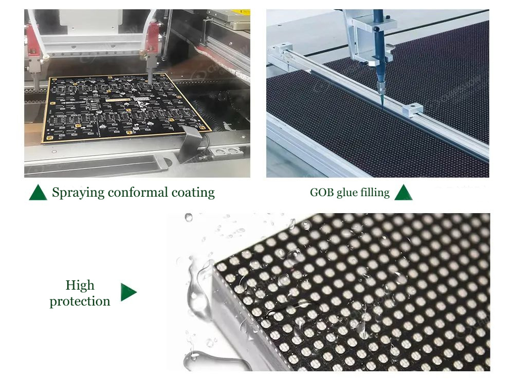 1. C-Lite-Plus P1.56 muss als Outdoor-Bildschirm über starke Schutzfunktionen verfügen. Chipshow hat Schutzlack auf seine Module gesprüht und wasserdichte Gummiringe angebracht. Die Vorderseite der Module verfügt über eine GOB- und Leimgussbehandlung für mehrfachen Schutz. Die handwerkliche Verarbeitung verbessert die Wasserbeständigkeit und Luftdichtheit von C-Lite-Plus erheblich und es kann stabil im Freien verwendet werden.