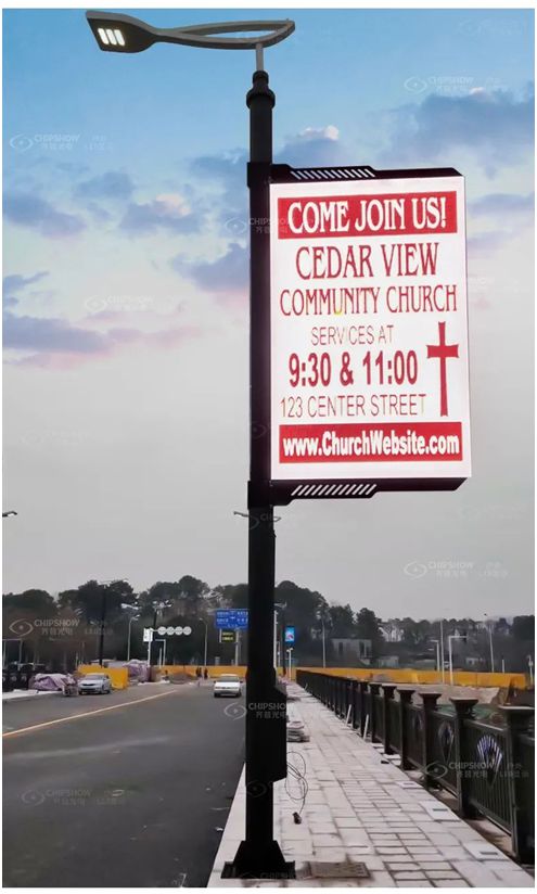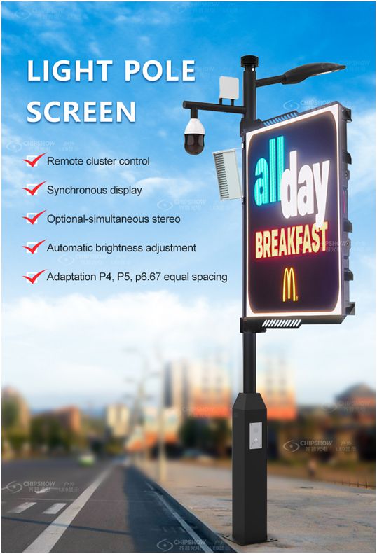 Der von Chipshow eingeführte LED-Lichtmastbildschirm zeichnet sich durch geringe Abstände, hohe Auflösung und eine klare und feine Bildqualität aus. Es kann einfach und schnell direkt mit einem Ring am Straßenlaternenmast befestigt und installiert werden. Intelligente Steuerung, Clustersteuerung und 5G-Netzwerkgruppensteuerungsgruppenübertragung; Es kann alle gedruckten Werbeanzeigen auf dem Lichtmast ersetzen und ist nach der Installation lebenslang wiederverwendbar. es hat eine starke visuelle Wirkung und kann beleuchtet werden, um rund um die Uhr Werbung abzuspielen; Es verfügt über eine große Informationskapazität, selbst erstellte Programme können sofort abgespielt werden und der Inhalt ist reichhaltig und in regelmäßigen Abständen zielgerichtet. Kostengünstig, umweltfreundlich und kohlenstoffarm.